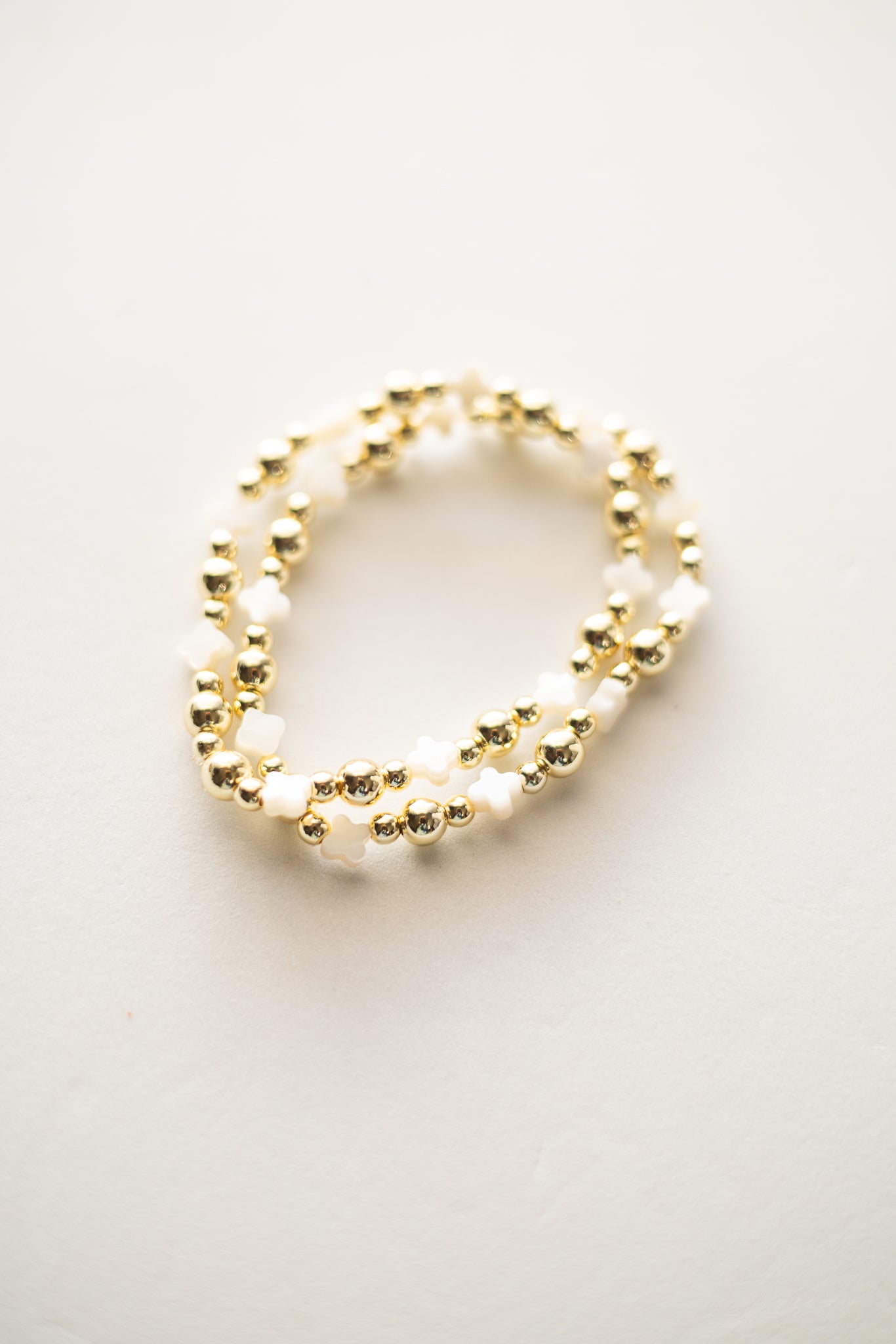 Ivory Bloom is a delicate, luxe bracelet featuring polished 14k gold filled beads paired with soft ivory flower accents for a feminine, elevated touch. Light, timeless, and effortlessly elegant, this bracelet is perfect for everyday wear or layering into a refined, boutique-style stack. A beautiful balance of subtle detail and classic gold shine.